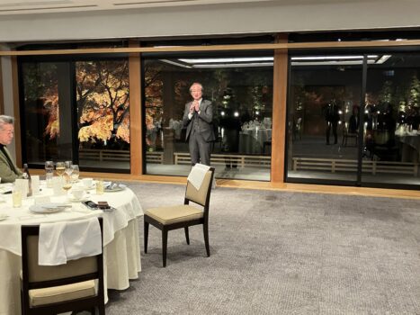 会場横の庭園内はキレイな紅葉がライトアップされ、小雨がより一層ステキな雰囲気を醸し出すなか会が始まりました。